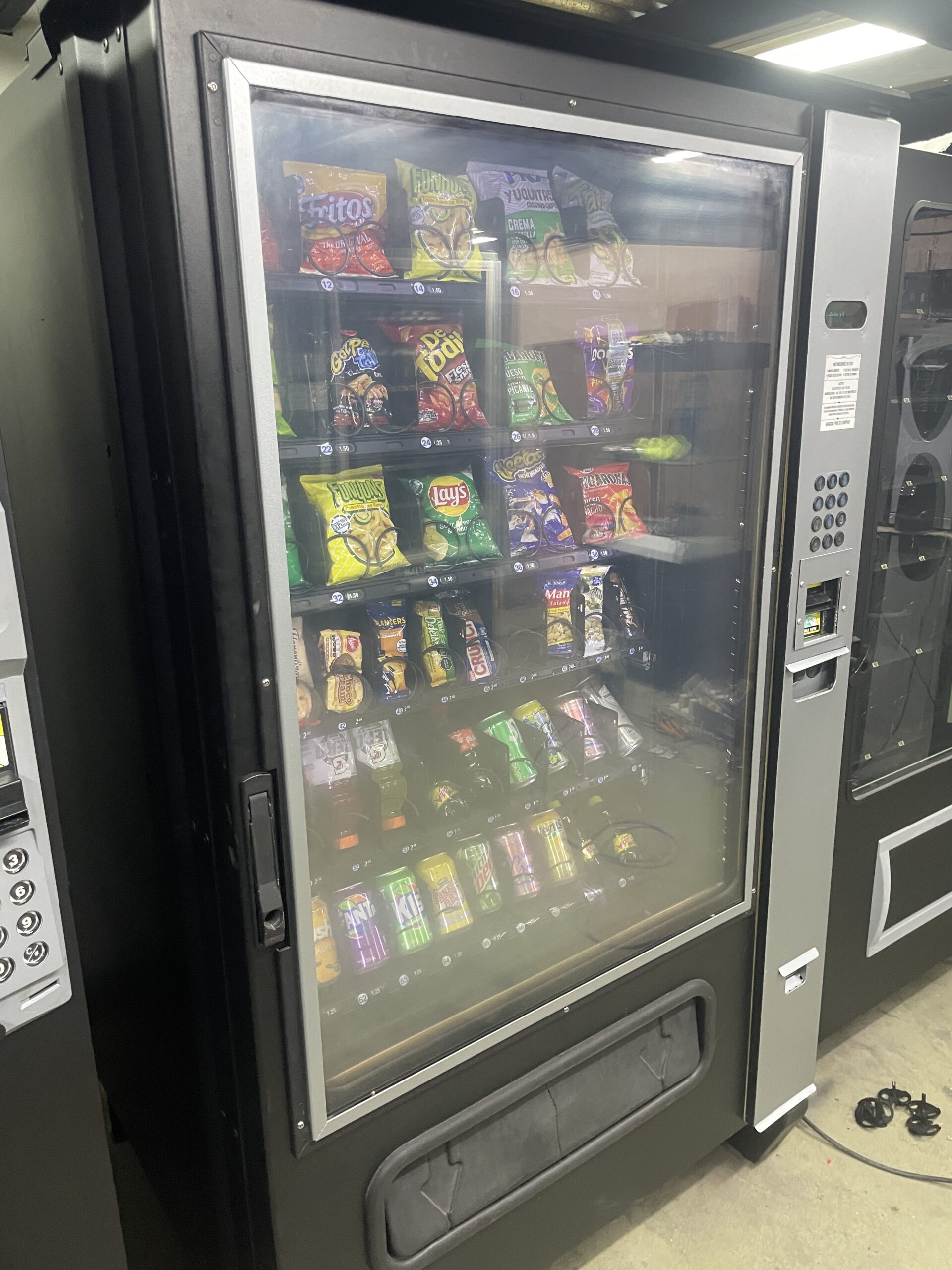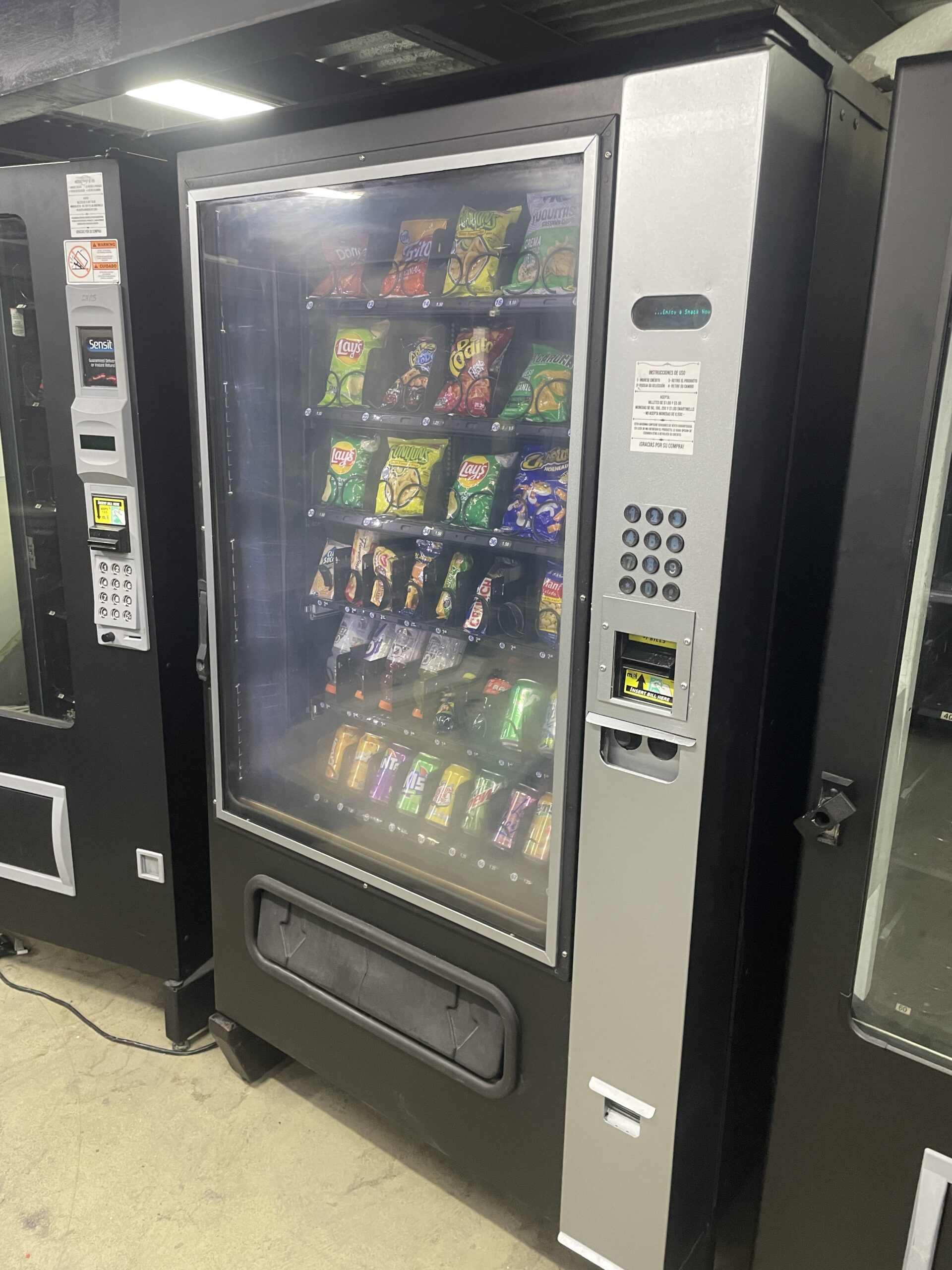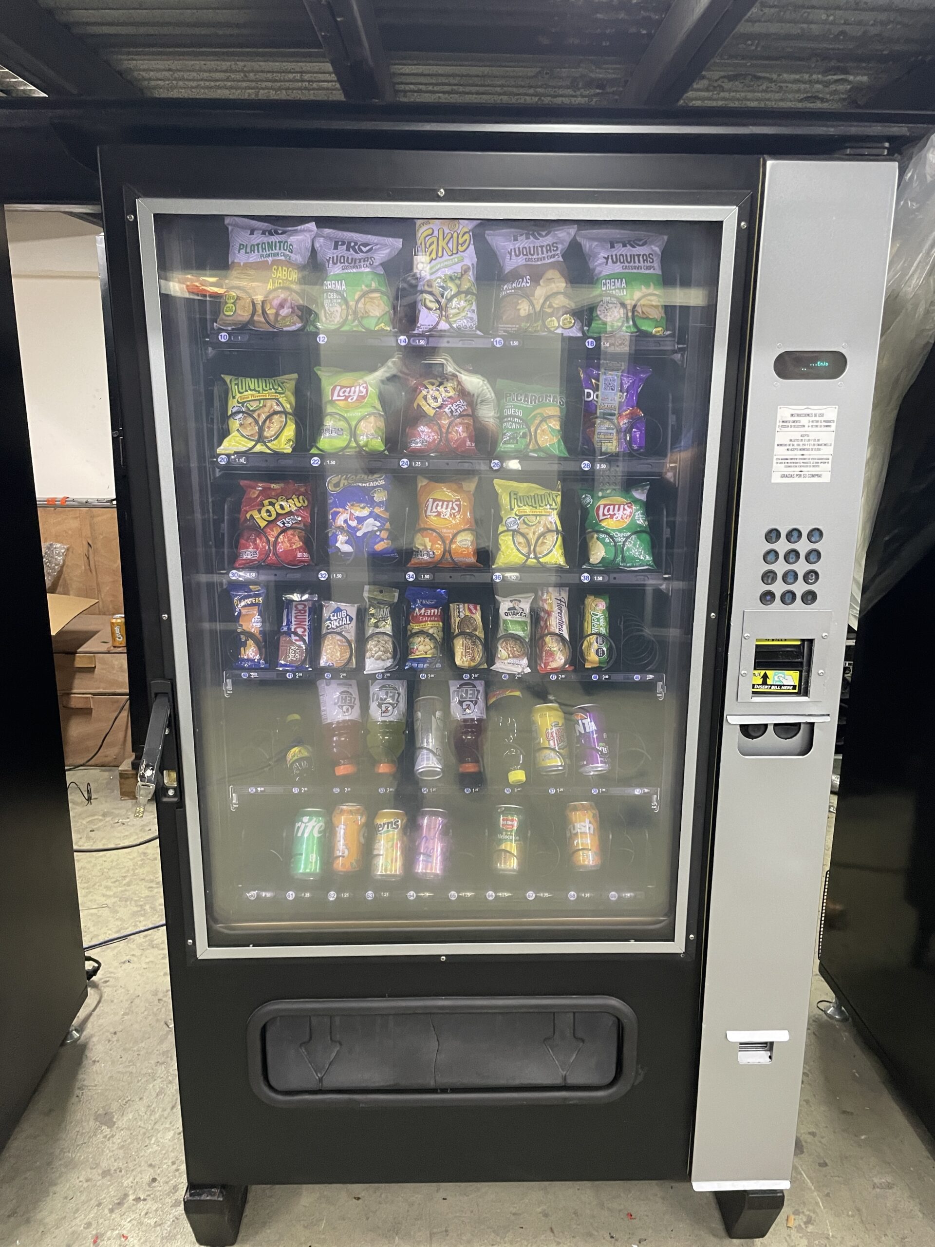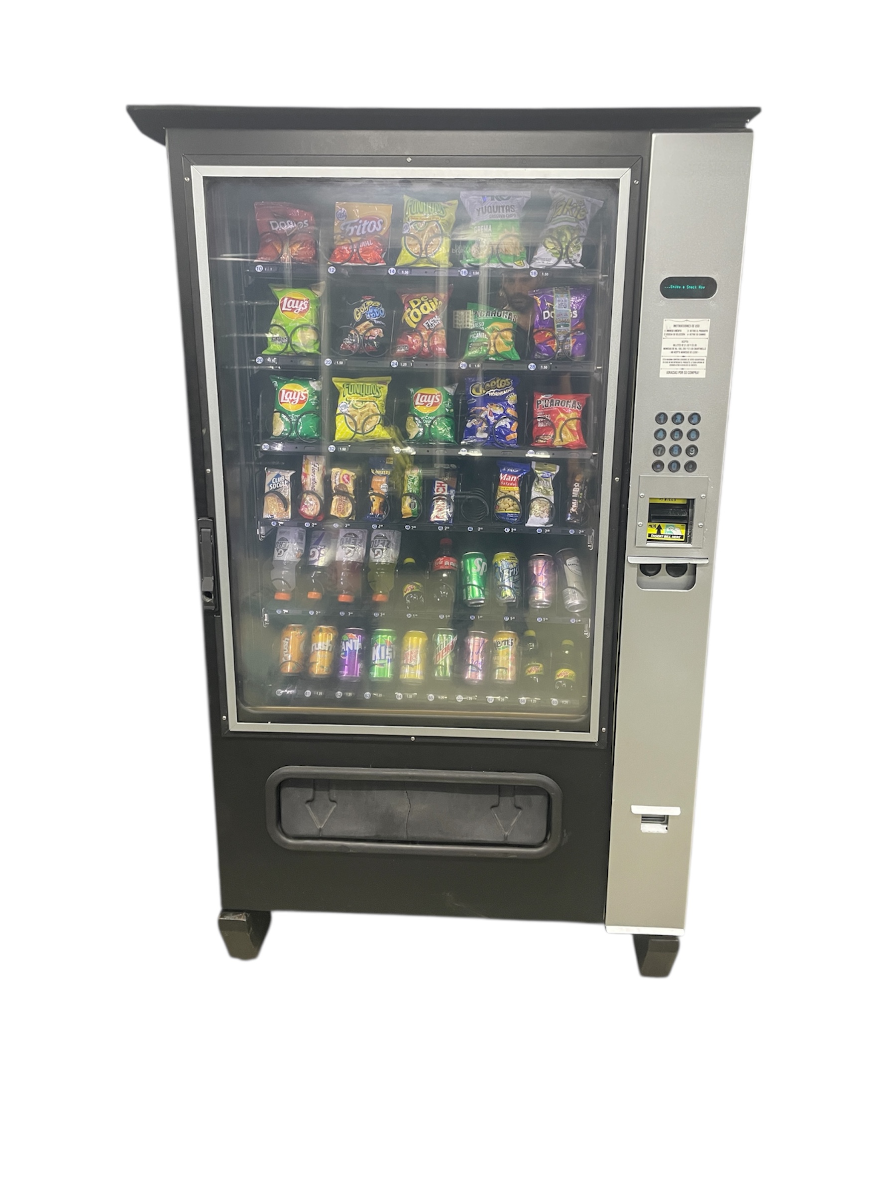 Capacidad para venta de 120 sodas + 280 Snacks. Aceptación de monedas y billetes, pagos con tarjeta opcional.